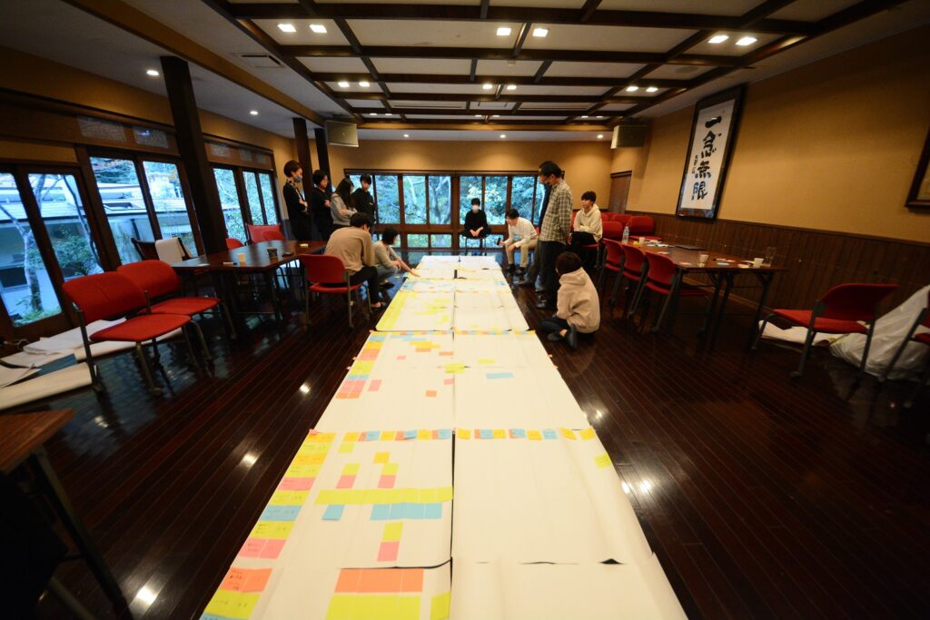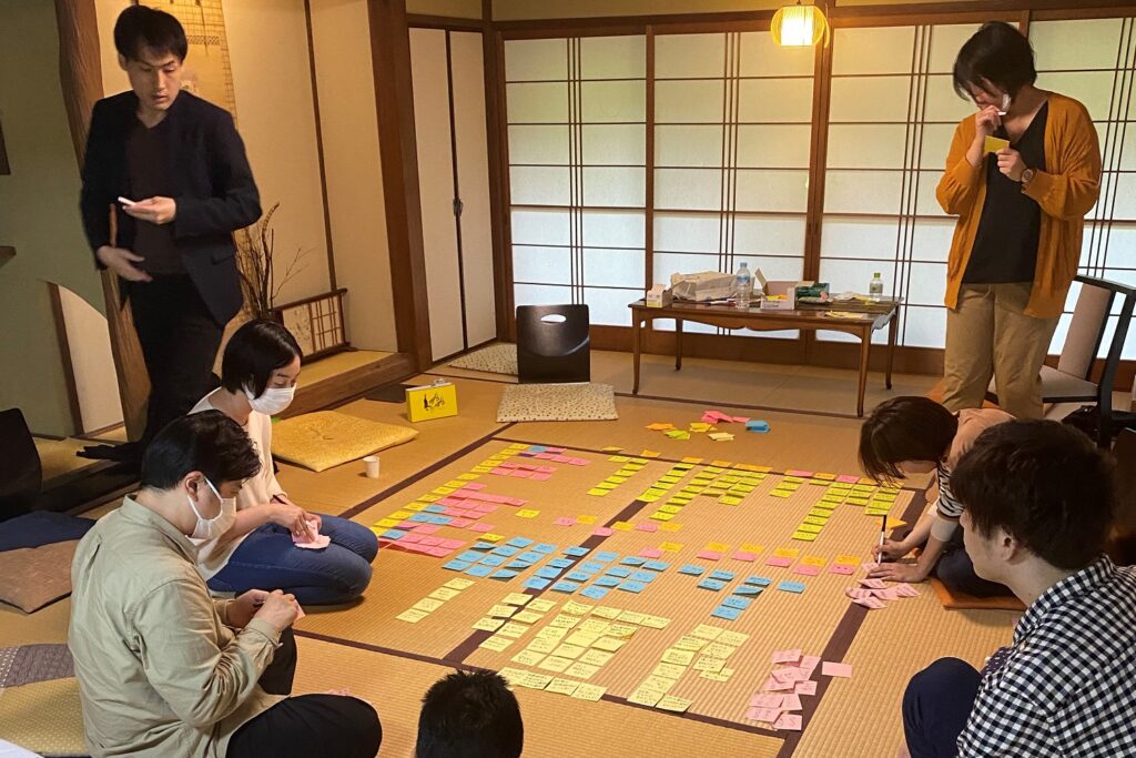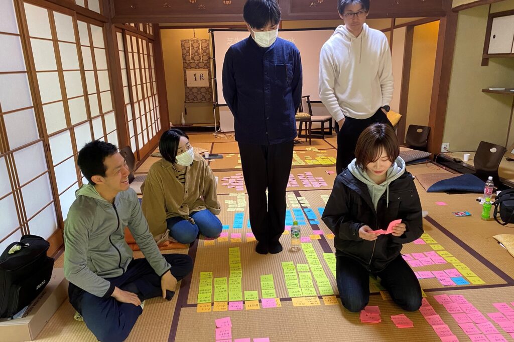 昨年秋の7名から、3名増えて10名での合宿となりました。もはやいつものリビングスペースでは追いつかず、付箋も模造紙も広げることができなくなり、スケジュールのほとんどは初めから和室で行われました…。