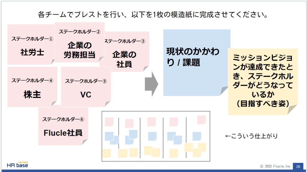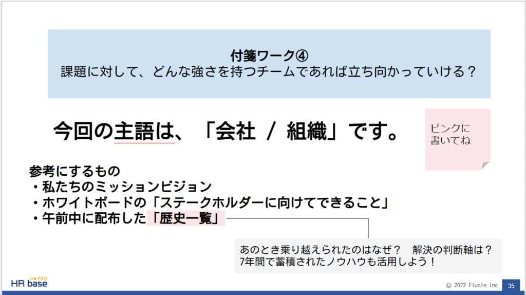 まずはこれまでのサービスの歴史を知る時間を取り、「なぜ、私たちが労務業界でサービスを展開しているのか」「最初のトライはどこから始まったか」を共有し、主語を自分から「社会 / ステークホルダー」に移してのワークが延々と続きます。