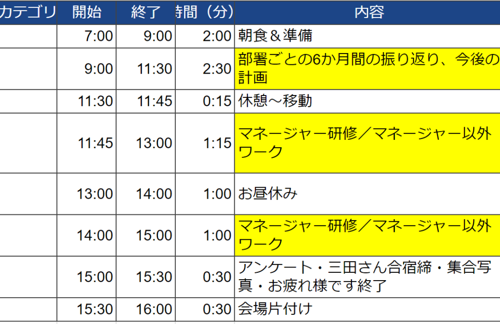 部署ごとの半年間の振り返りを済ませ、午後はマネージャーとマネージャー以外に分かれた研修です。実は階層別の研修をするのは初めて。これまで「とにかく全員で」が成り立っていたのですが、いよいよ、それぞれの階層の課題や目標に照準を当てた時間が必要になってきたようです。